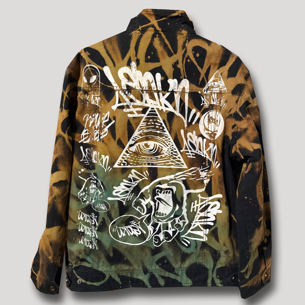 This unique garment features a complex urban camouflage pattern made from various layers of tags, each dyed in its own distinct color. With only one of each piece available, each item offers a one-of-a-kind appeal. The production process involves multiple steps, including reverse tie-dying, adding brass spikes, multiple layers of dying, and printing on durable, comfortable, and warm MILITARY JACKETS. Get yours today and embrace the outdoors with Never Sleep Urban Camo WEN VEN JACKET.