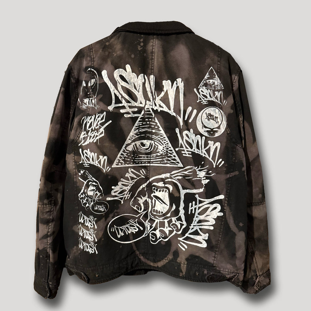This unique garment features a complex urban camouflage pattern made from various layers of tags, each dyed in its own distinct color. With only one of each piece available, each item offers a one-of-a-kind appeal. The production process involves multiple steps, including reverse tie-dying, adding brass spikes, multiple layers of dying, and printing on durable, comfortable, and warm LEVI'S MILITARY JACKETS. Get yours today and embrace the outdoors with Never Sleep Urban Camo LEVI'S MILITARY JACKET. PLEASE NOTE THIS IS NOT A DENIM JACKET.